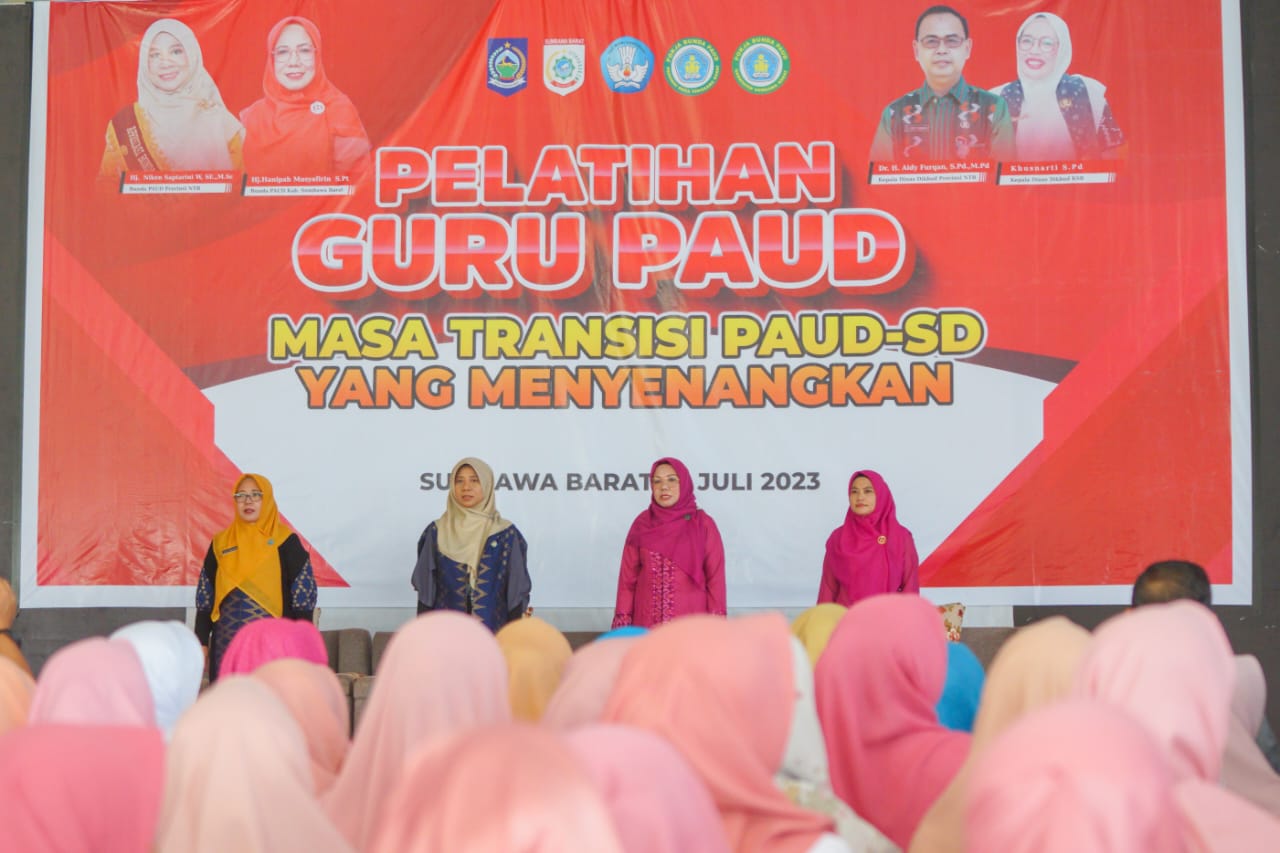 Bunda PAUD NTB, Hj. Niken Saptarini Widyawati, SE. M.Sc atau yang akrab disapa Bunda Niken, memberikan pelatihan terkait masa transisi dari Pendidikan Anak Usia Dini (PAUD) ke Sekolah Dasar (SD) di KSB, Rabu 12 Juli 2023. Pelatihan tersebut diikuti ratusan guru PAUD, Guru SD, dan Kader PKK yang ada di KSB.