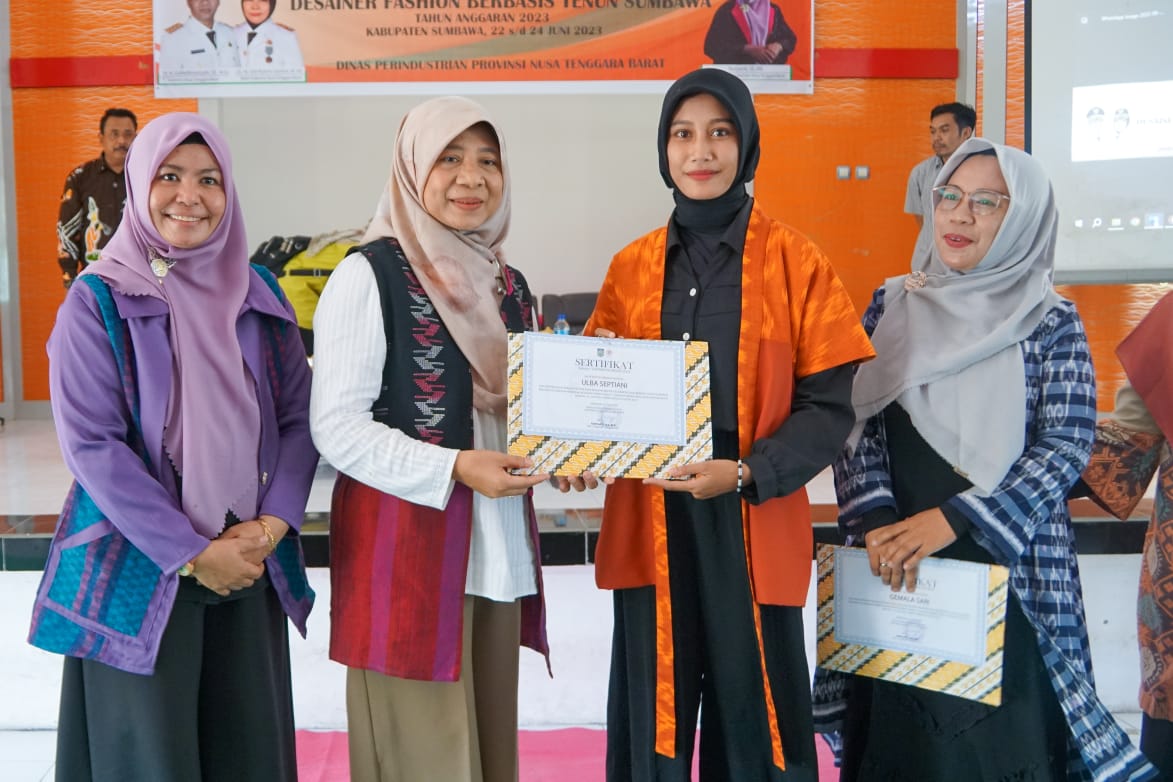 Ketua Dekranasda NTB, Hj. Niken Saptarini Widyawati Zulkieflimansyah menutup secara resmi Kegiatan Bimtek Fashion Designer Berbasis Tenun, bertempat di SMKN 1 Sumbawa Besar, (24/6).