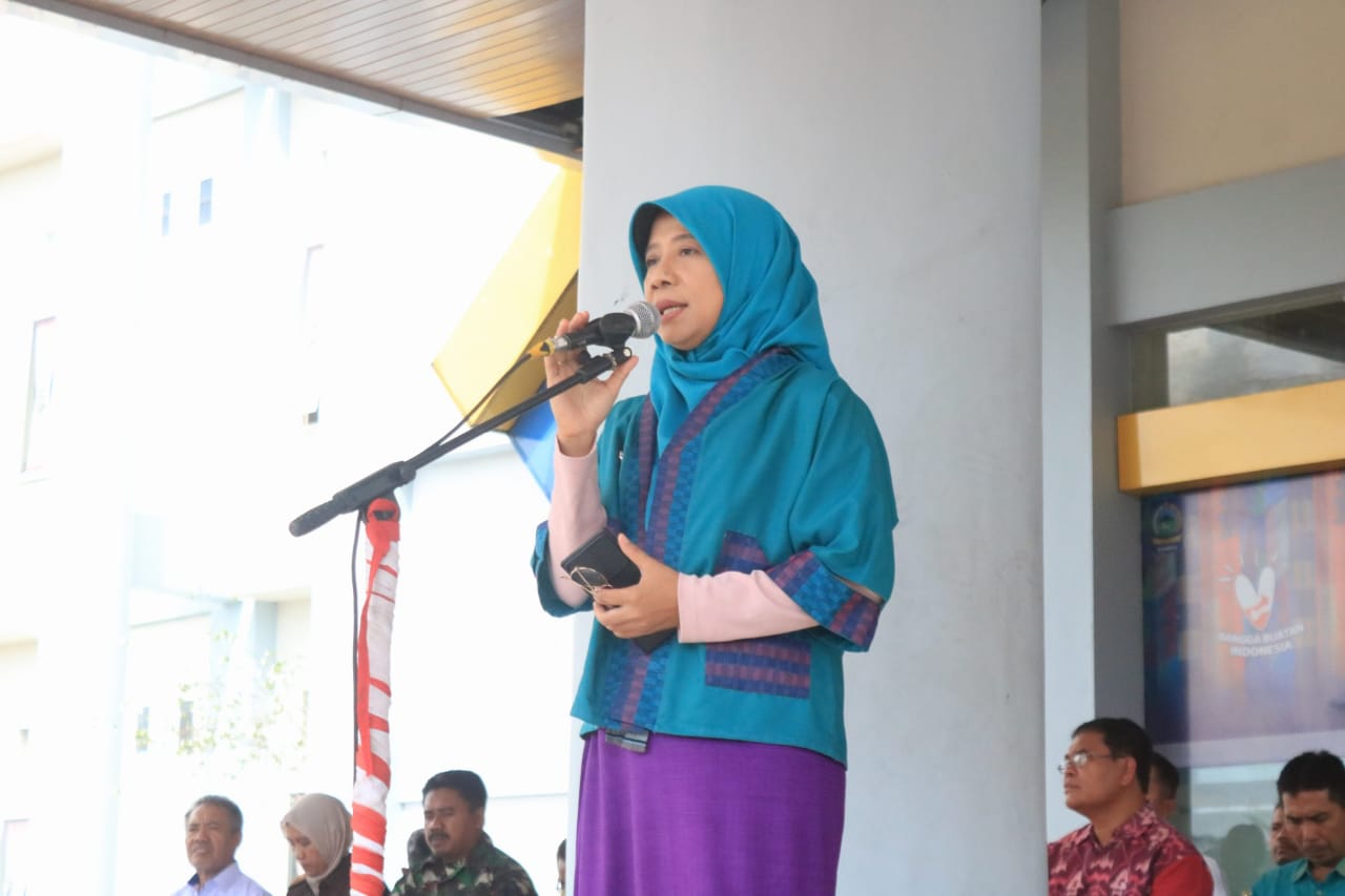 Dompu - - Bunda PAUD Provinsi NTB , Hj. Niken Saptarini Widyawati Zulkieflimansyah memberikan sambutan dalam Gebyar PAUD yang berlangsung di Halaman Kantor Bupati Dompu, Senin 24 Juli 2023.