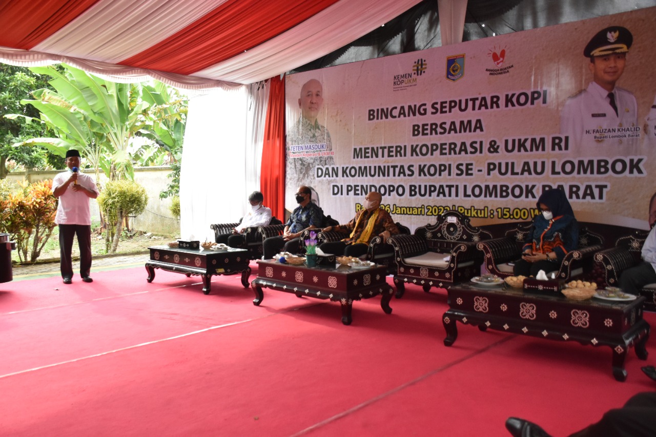 Lombok Barat-Menteri Koperasi dan UKM Teten Masduki didampingi Gubernur NTB Dr. H. Zulkieflimansyah, M.Sc menghadiri Bincang Seputar Kopi bersama Bupati Lombok Barat dan komunitas kopi se Pulau Lombok di Pendopo Bupati Lombok Barat, Giri Menang, Gerung, Rabu (26/1/2022).