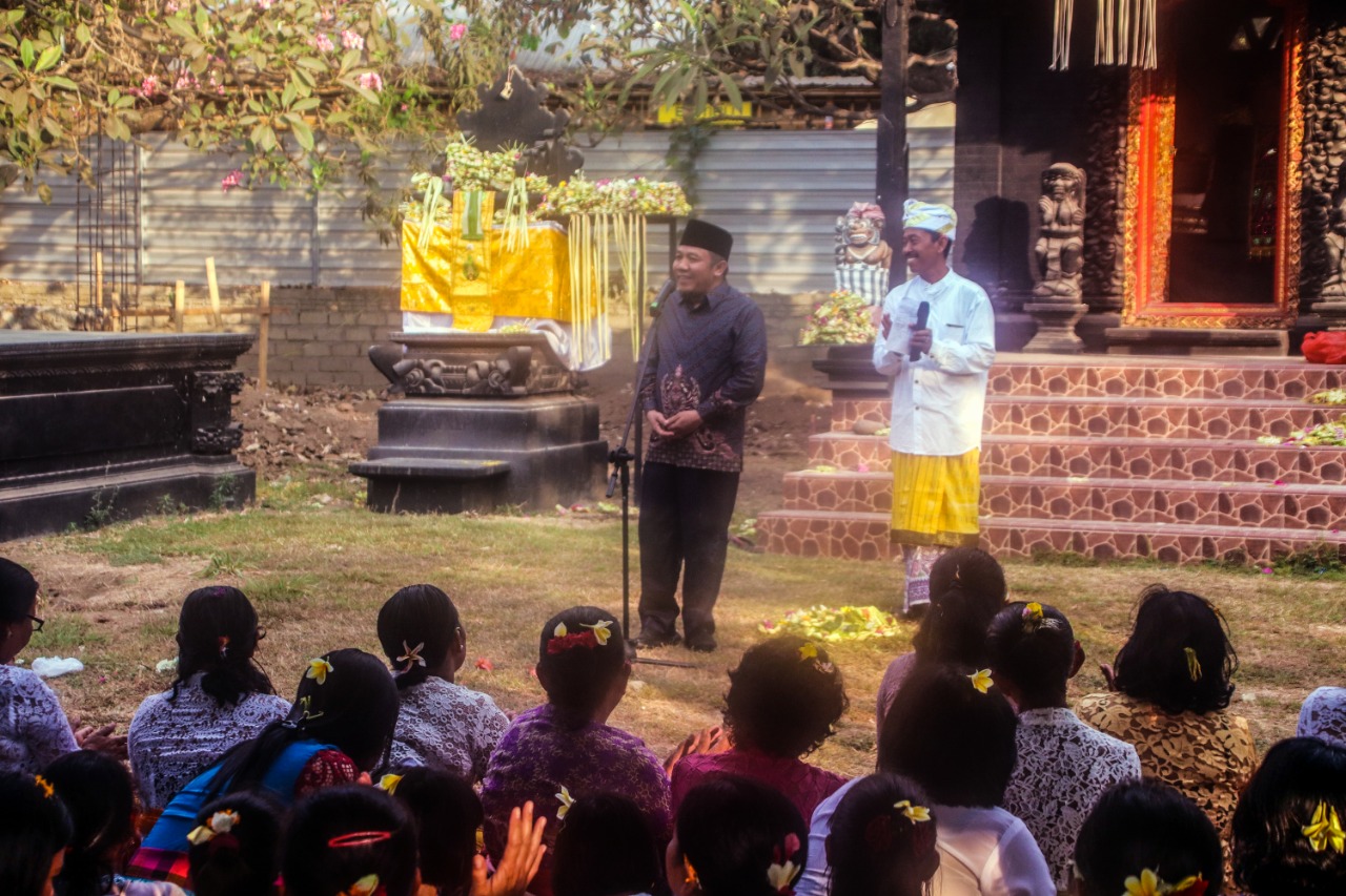 Foto: Bupati Lombok Utara, Dr.H. Najmul Akhyar, saat memberikan sambutan kepada ummat Hindu di Pure Dalem Tanjung, Jumat (30/8-2019).