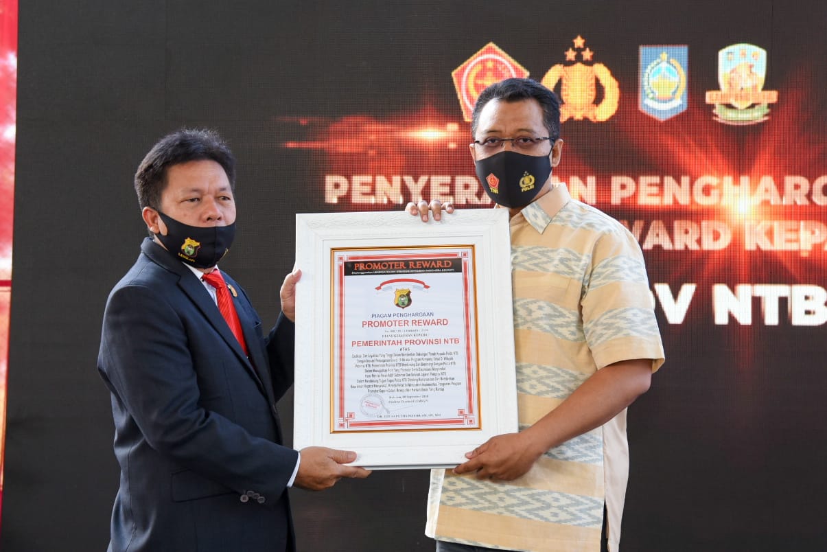Mataram -- Pemerintah Provinsi Nusa Tenggara Barat (NTB) menerima penghargaan dari Promoter Reward oleh Lembaga Kajian Strategis Kepolisian Indonesia (Lemkapi) atas dedikasi dan loyalitas yang tinggi dalam memberikan dukungan penuh terhadap Polda NTB dengan inovasi pencegahan Covid-19 melalui Kampung Sehat. Selasa (8/9/2020) di Lapangan Tenis Mapolda NTB.
