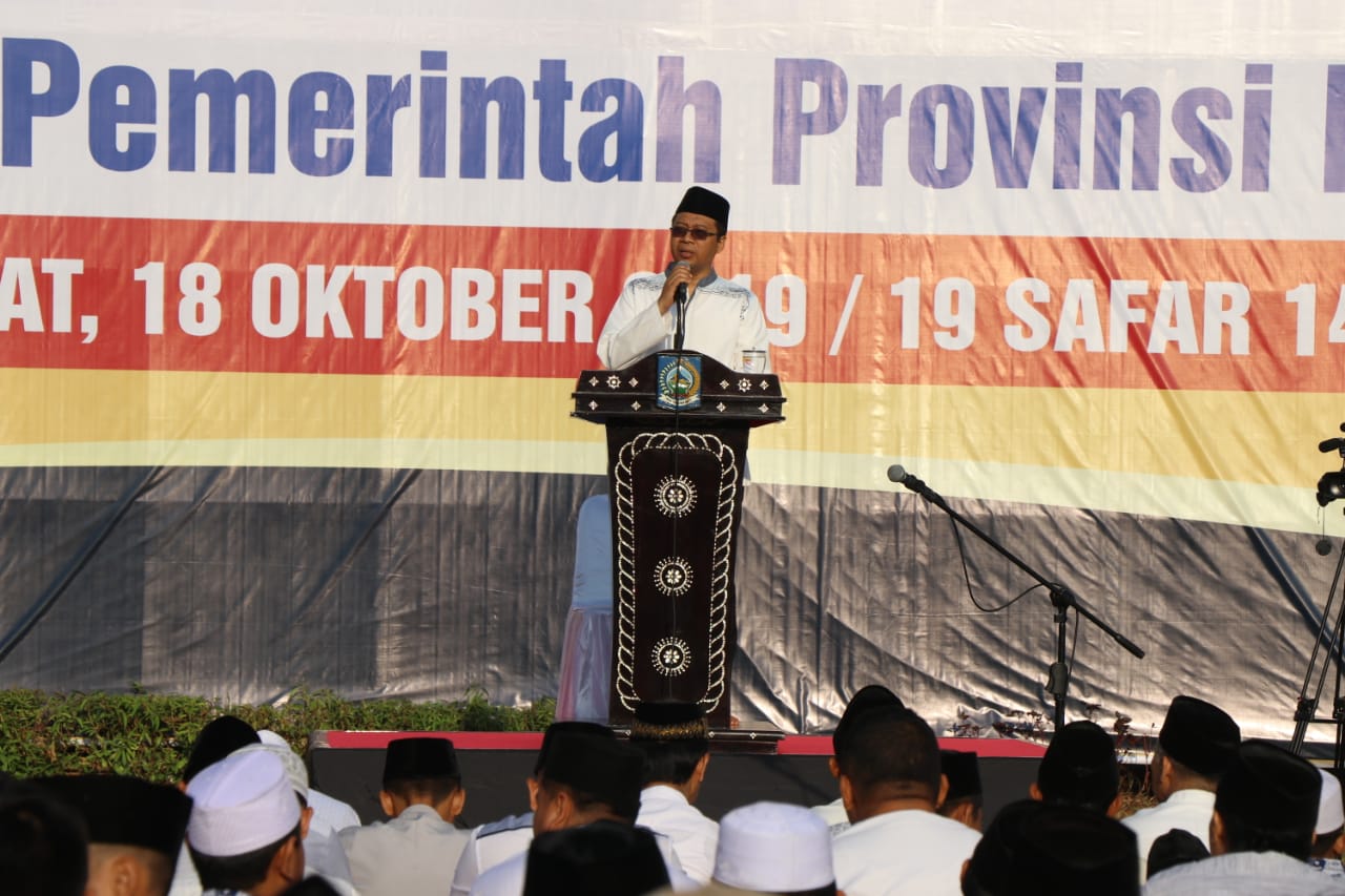 Foto: Gubernur Provinsi Nusa Tenggara Barat, Dr. H.Zulkieflimansyah saat memberikan khutbah singkat dalam pelaksanaan Sholat Istisqa’ di Lapangan Bumi Gora Kantor Gubernur NTB di Mataram, Jum’at (18/10 – 2019).